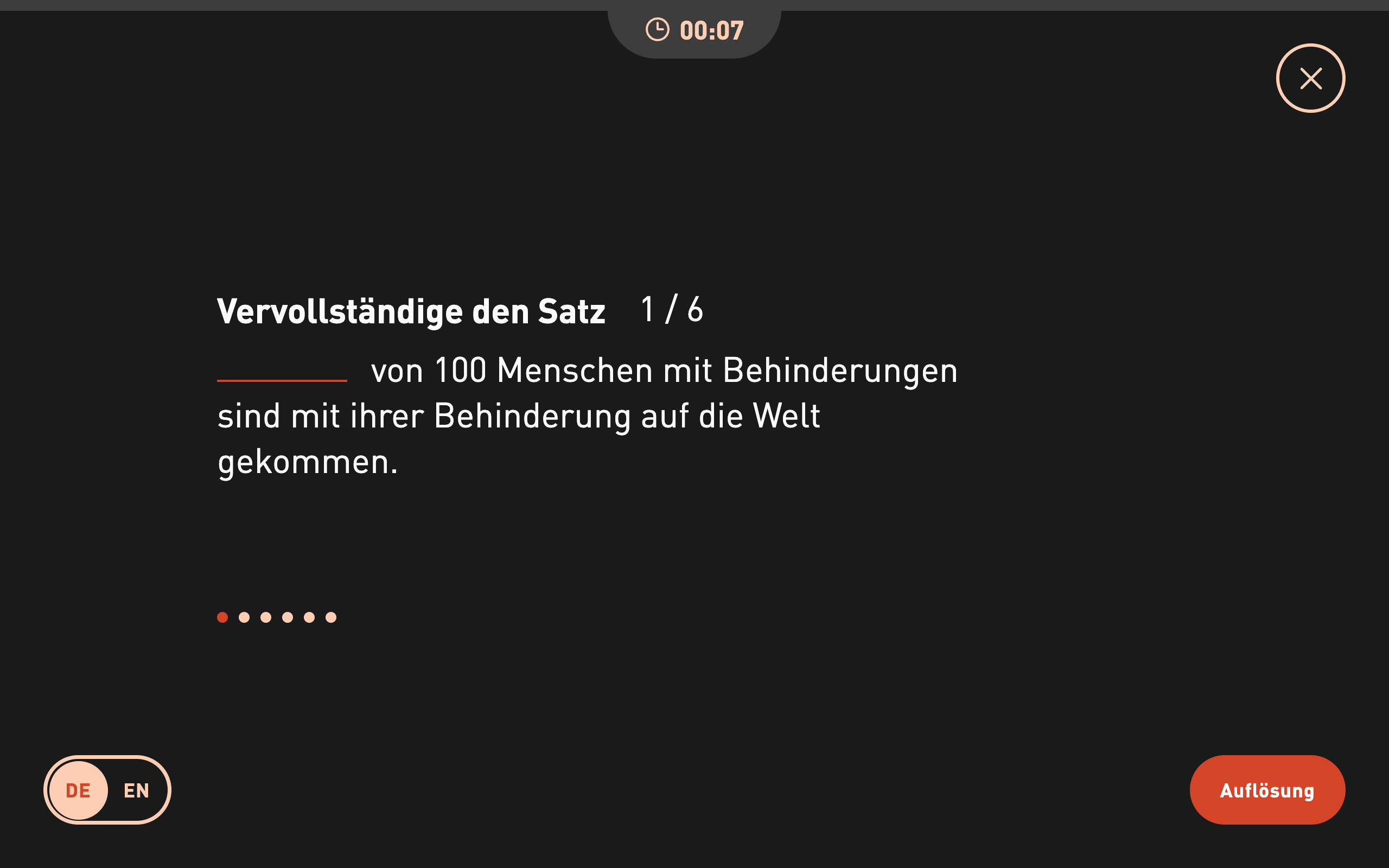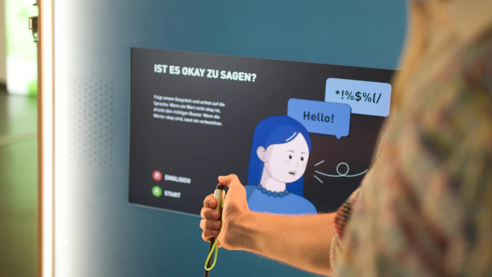 Ein interaktives Gruppenspiel regt zur Diskussion über Sprache und Inklusion an. Das 4-Player-Buzzer-Spiel fordert die Spieler dazu auf, politisch unkorrekte oder verletzende Worte zu erkennen. Jeder Spieler hat eine eigene Farbe, die bei einer korrekten Erkennung aufleuchtet. Dieses Exponat sensibilisiert für die Wirkung von Sprache und fördert das Bewusstsein für respektvollen Umgang.