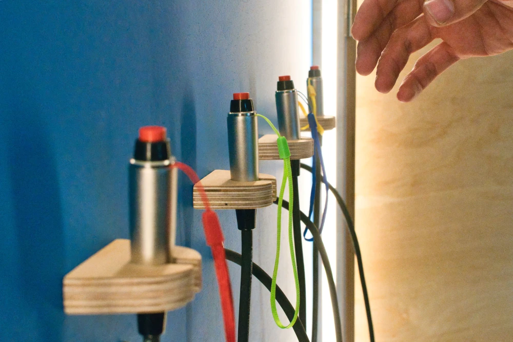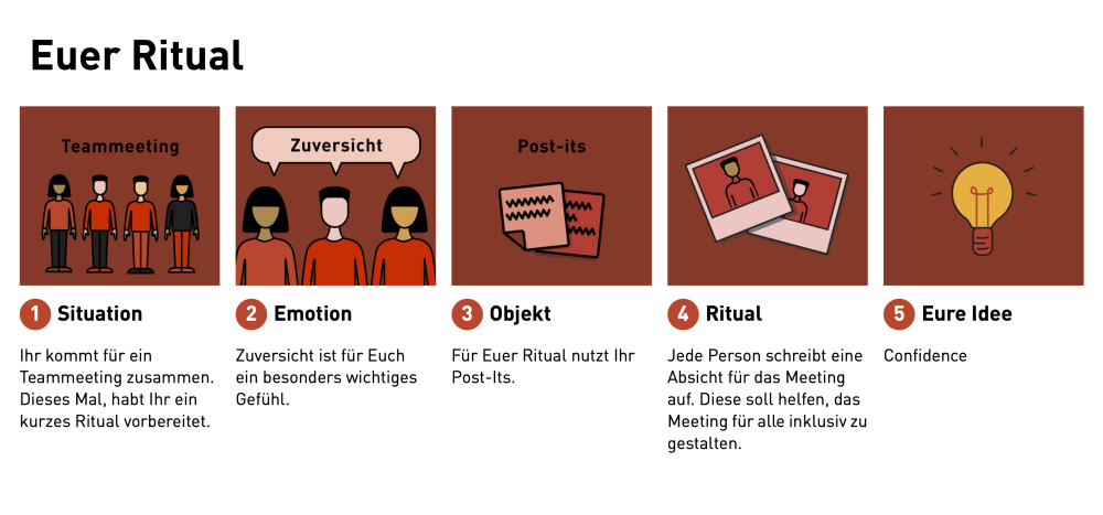 Ein anderes Exponat dient dazu, in der Gruppe ein Ritual für ihren Berufsalltag zu generieren, das zum Abschluss ebenfalls online abrufbar ist. Die technische Basis bildet eine MySQL-Datenbank, die die Daten über eine API in Electron speichert und durch ein PHP-Skript für die Plattform aufbereitet.