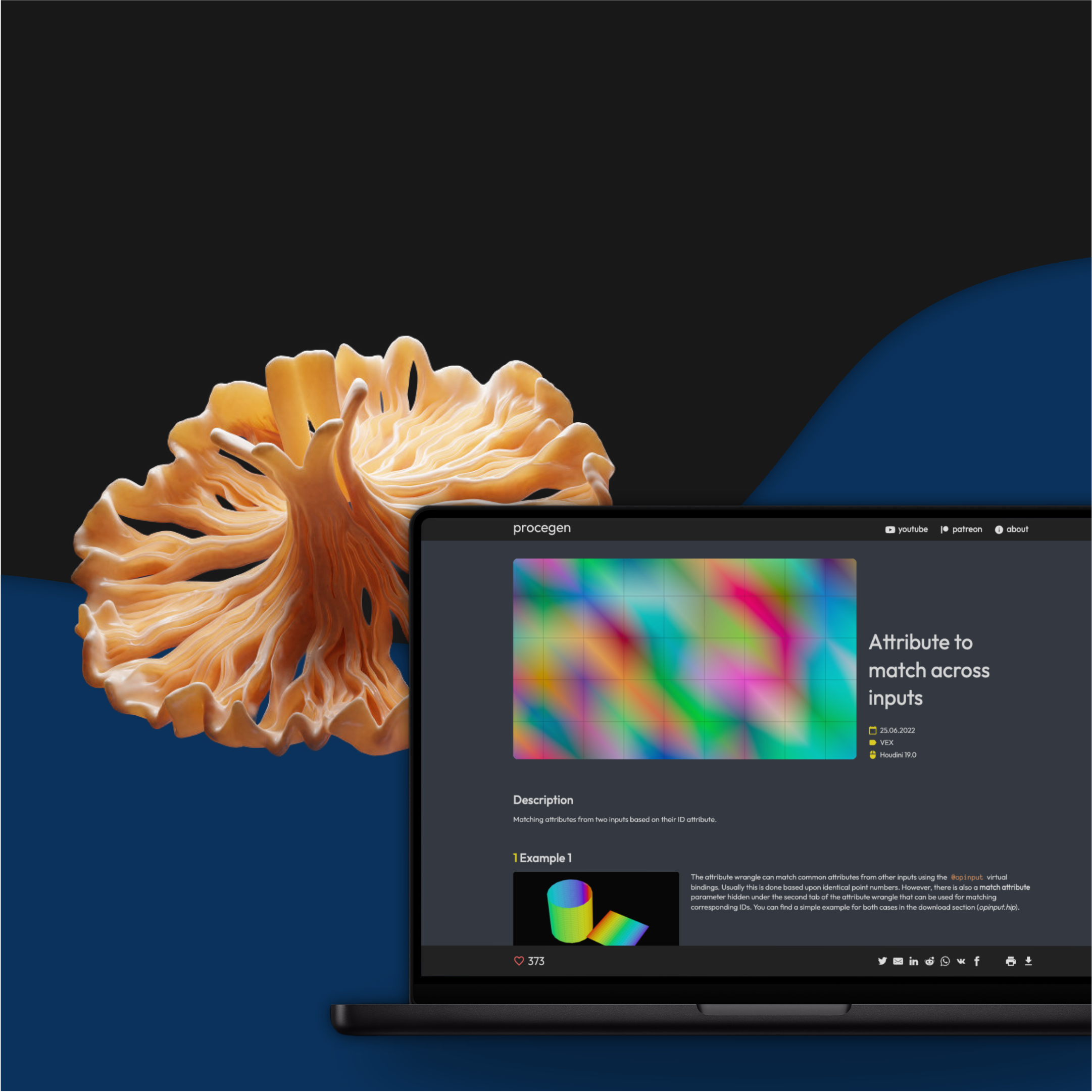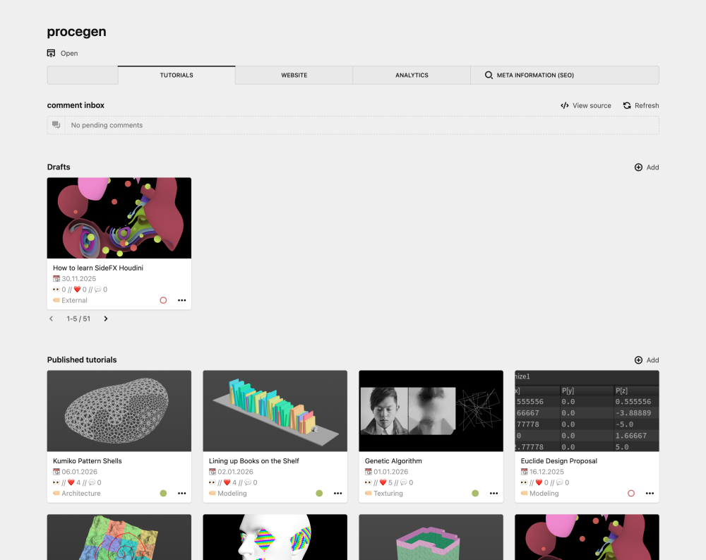 Procegen ist eine Plattform, welche eine große Bandbreite (250 Stück - stand 01/26) an Tutorials für das generative 3D-Programm Houdini bietet.