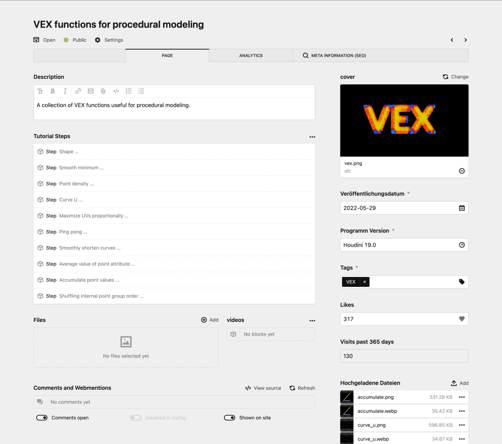 In seiner Laufbahn als 3D-Artist und treibende Kraft in der Houdini-Szene hat Konstantin Magnus bereits einige Anleitungen veröffentlicht, jedoch verstreut in Foren, Nachrichten und kaum auffindbar für weitere. Um diese zu sammeln und der Houdini-Szene etwas zurück zu geben, benötigte er Möglichkeit, speziell auf diesen Use-Case abgestimmt.