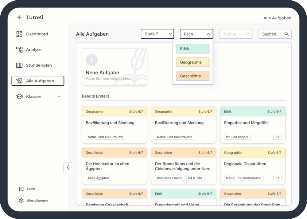 In der Bibliotheksansicht von TutoKi werden verschiedene Optionen und Themen angezeigt, die für den Unterricht relevant sind. Lehrkräfte können neue Aufgaben hochladen oder erstellen, und Schüler:innen können auf diese Aufgaben zugreifen und sie bearbeiten. Die Bibliothek bietet eine übersichtliche und benutzerfreundliche Oberfläche, die den Austausch und die Organisation von Unterrichtsmaterialien erleichtert.