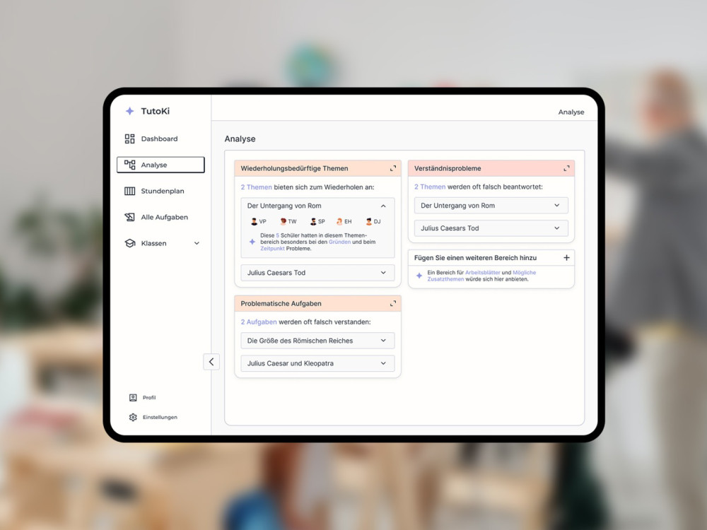 Das Analyse-Tool von TutoKi gibt Lehrkräften Empfehlungen basierend auf Bereichen, in denen die Schüler:innen zusätzliche Unterstützung benötigen. Diese Empfehlungen helfen der Lehrkraft, den folgenden Unterricht besser vorzubereiten und gezielt auf die Bedürfnisse der Schüler:innen einzugehen. Durch die Analyse von Aufgaben und Lernfortschritten können Lehrkräfte effektiver unterrichten und den Lernerfolg ihrer Schüler:innen steigern.